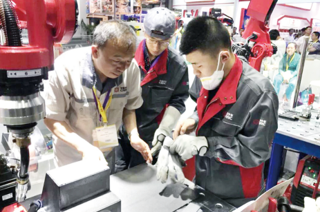 “全国技术能手”李继欣(右一)正在操作机器人焊接机车部件